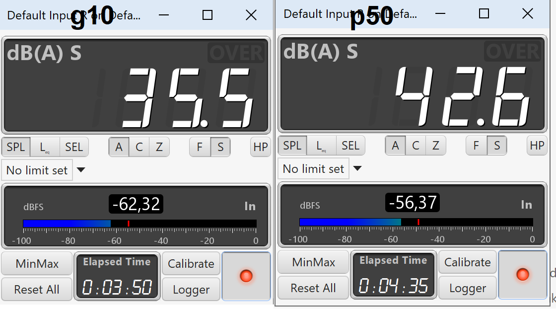 Channel balance, compression, THD. Measured with the shallowest insertion. Subjectively there's a fairly wide 10kHz peak, 5dB Q=2, 6.7kHz peak is lower than usual, 3dB. During a sweep I heard two tones during 200Hz-1000Hz so I expected the distortion to be worse. The silhouette of p50 is smaller than g10 but p50 is much taller, for me the fit is less secure. I'll rock it for a couple of days but will probably stick with g10.